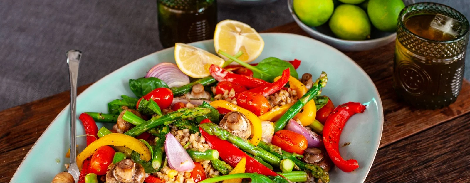 Let the last of summer’s best produce shine with my rustic roasted veggie dish, paired with grains and a drizzle of homemade basil pesto. This is a vibrant, flavor-packed dish that I created and it can be served warm or chilled as a refreshing salad. Another option is to replace the asparagus with broccoli.